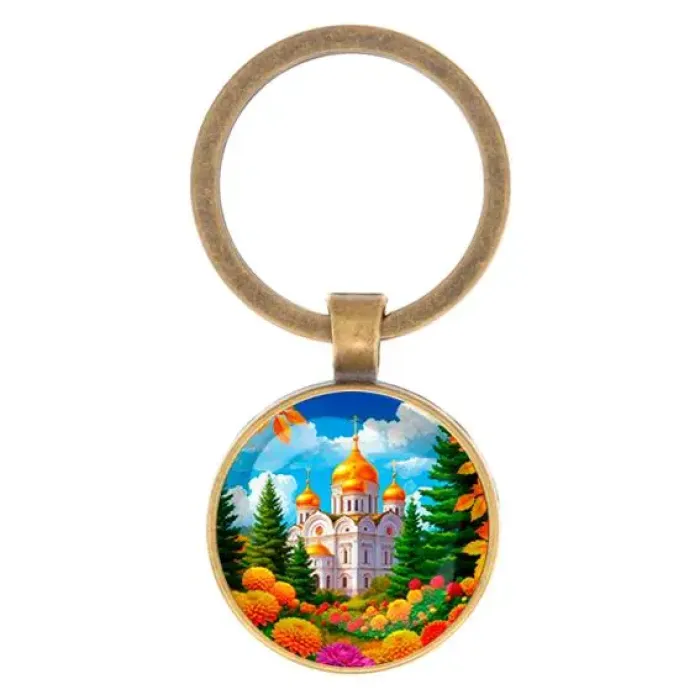 Круглый брелок, цвет бронза, Храм и цветы C1162017