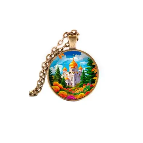 Кулон «Храм и цветы» — это изысканное украшение, которое сочетает в себе элементы искусства и природы. Он выполнен из бижутерного сплава с покрытием под бронзу и стекла, что придаёт ему уникальный шарм.
