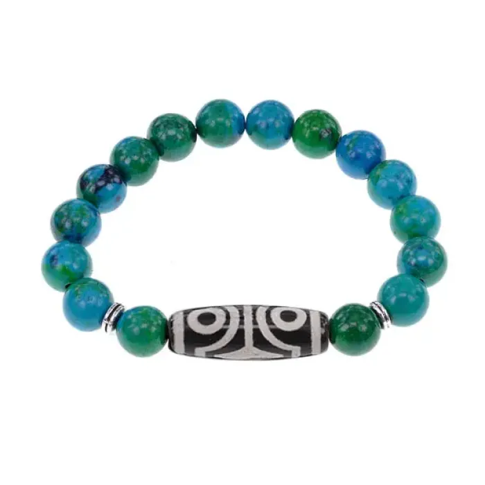 Стрейч-браслет с тибетской бусиной Дзи из агата и синтетическим камнем.