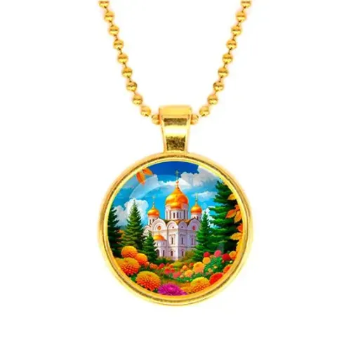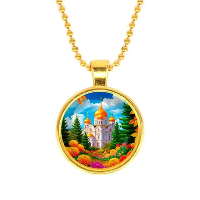 Элегантный кулон с изображением храма и цветов станет изысканным дополнением любого образа. Изготовленный из бижутерного сплава с покрытием под золото и стекла, он привлекает внимание своим утонченным дизайном.