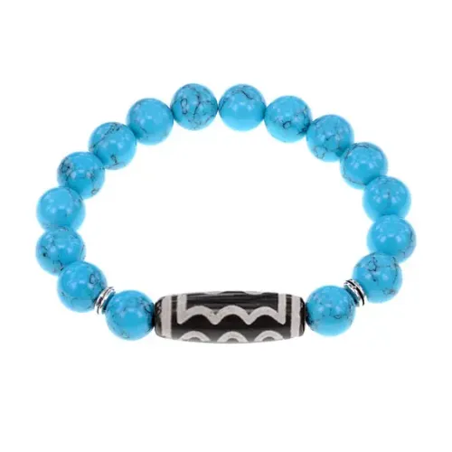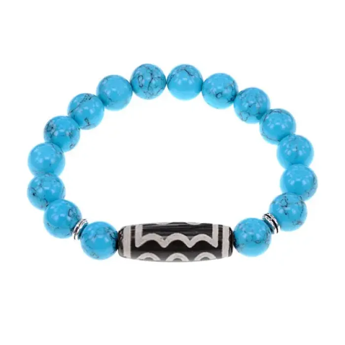 Стрейч-браслет из синтетического камня, имитирующего бирюзу, с тибетской бусиной Дзи из натурального агата.