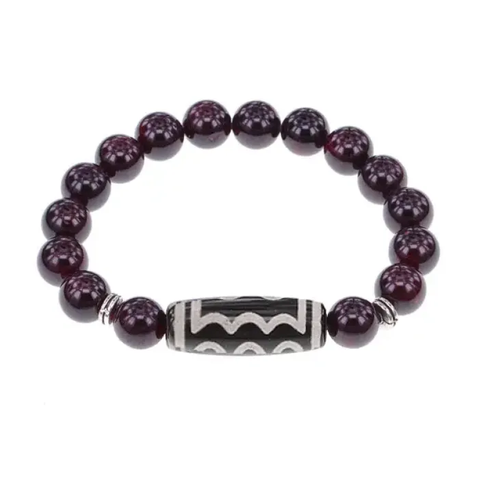 Стрейч-браслет из натурального камня гранат с тибетской бусиной Дзи из агата.