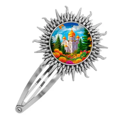 Металлическая заколка в нежных тонах с изображением храма и цветов станет прекрасным украшением для любого образа. Изготовленная из бижутерного сплава с покрытием под серебро и стеклом, она сочетает в себе элегантность и стиль. Размер заколки составляет 77 x 45 мм, а изображение защищено выпуклой стеклянной линзой, что придаёт изделию особую выразительность. Такой аксессуар не только подчеркнёт индивидуальность, но и добавит нотку утончённости в повседневный или праздничный наряд.