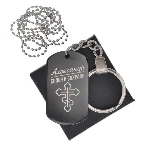 Размеры и комплектация: Размер жетона 49х28 мм. В комплекте кольцо для ключей, шариковая цепочка с регулировкой длины и подарочная коробка.