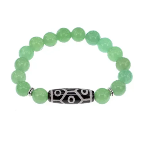 Стрейч-браслет из натурального камня с тибетской бусиной Дзи. Основные материалы — агат и нефрит.