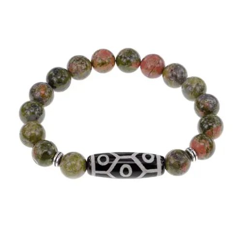 Стрейч-браслет из натурального камня унакит с тибетской бусиной Дзи из агата.