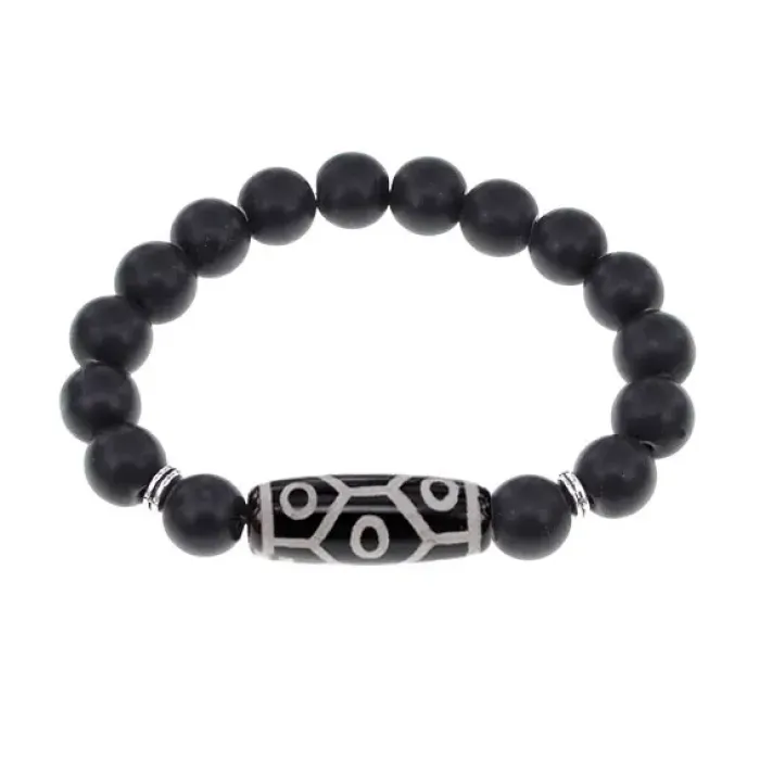 Стрейч-браслет из синтетического камня, имитирующего шунгит, с тибетской бусиной Дзи из агата.