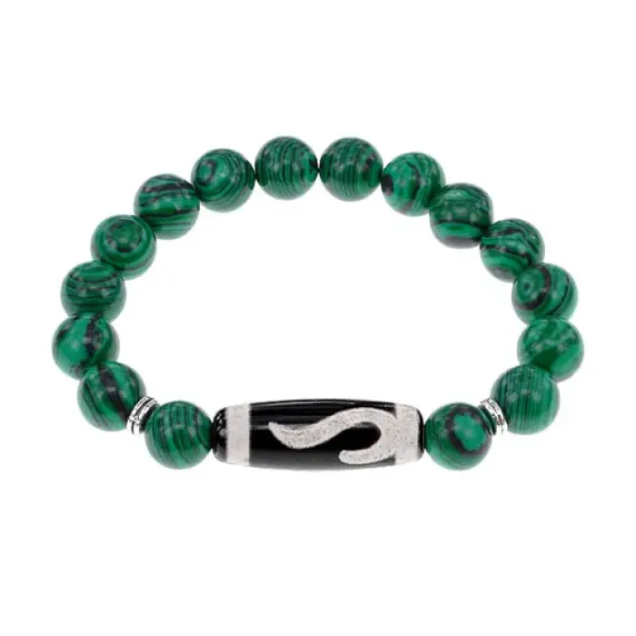 Стрейч-браслет для ношения, украшенный тибетской бусиной Дзи из агата и синтетическим камнем, имитирующим малахит.