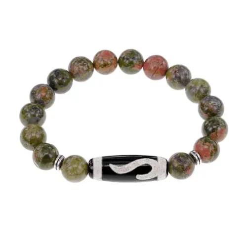 Стрейч-браслет из натурального камня унакит с тибетской бусиной Дзи из агата в виде золотого ключа.
