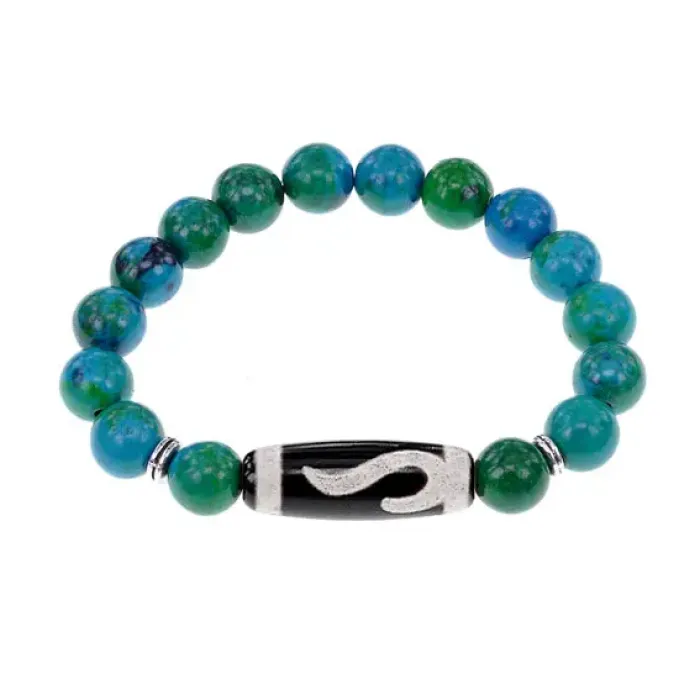 Стрейч-браслет из синтетического камня, украшенный тибетской бусиной Дзи из агата.