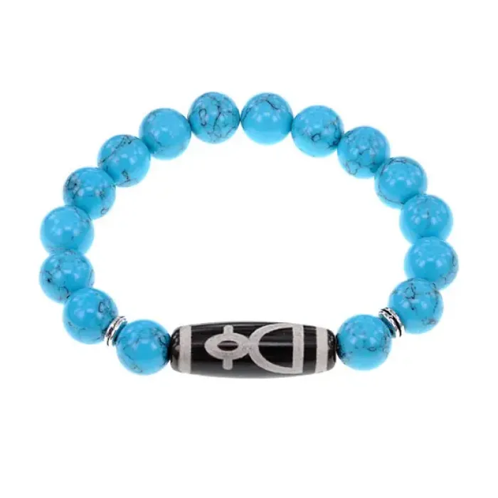 Стрейч-браслет из синтетического камня, имитирующего бирюзу, с тибетской бусиной Дзи из агата.