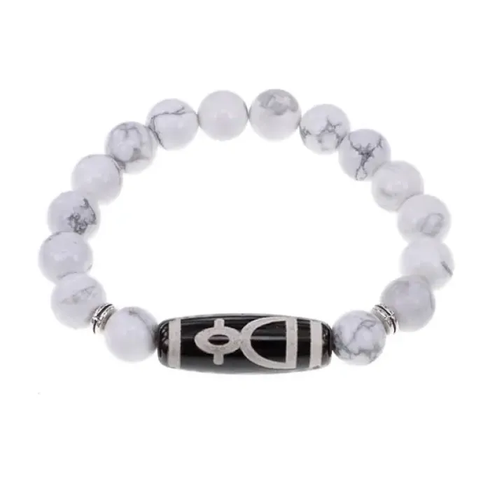 Стрейч-браслет из натурального камня кахолонг с тибетской бусиной Дзи Кубера из агата.
