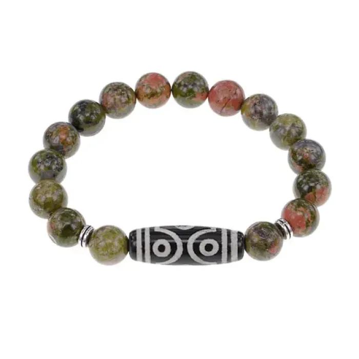 Стрейч-браслет из натурального камня унакит с тибетской бусиной Дзи из агата.