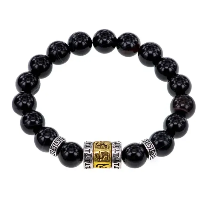 Стрейч-браслет из натурального черного агата с тибетской бусиной Молитвенного барабана.