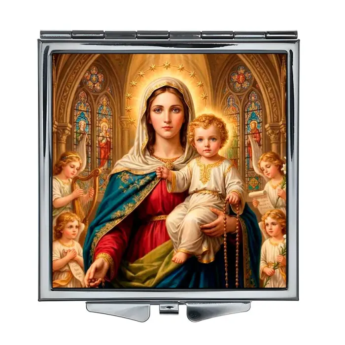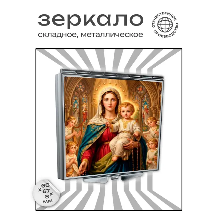 Складное зеркало квадратной формы с изображением Богородицы и Иисуса — это не только практичный аксессуар, но и символ веры. Оно станет прекрасным подарком для близких или элементом декора.