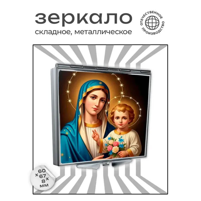 Складное зеркало квадратной формы с изображением Богородицы и Иисуса — это не только практичный аксессуар, но и символ духовности. Изготавливается из качественных материалов: металл и стекло, что обеспечивает долговечность изделия. Размер зеркала составляет 60х67х8 мм, что делает его удобным для ношения в сумке или кармане. Полноцветная печать на металле гарантирует яркость и четкость изображения, подчеркивая его художественную ценность. Это изделие станет прекрасным подарком для тех, кто ценит религиозные символы и красоту в повседневных предметах.