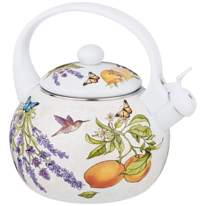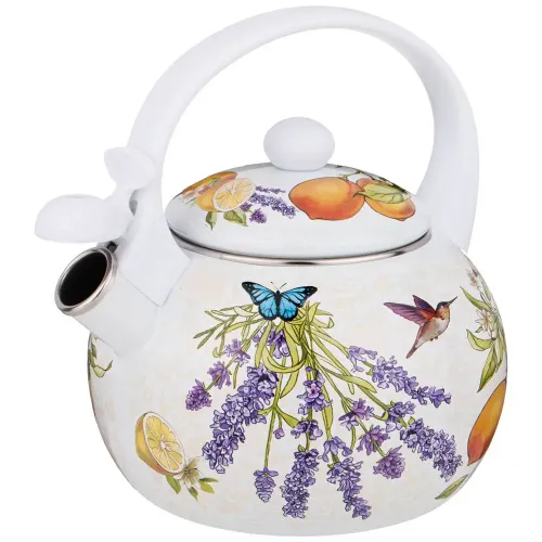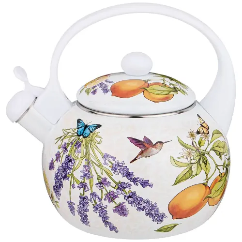 Эмалированный чайник со свистком Agness из серии «Прованс Лимоны» предназначен для кипячения воды на плите. Модель объёмом 2,2 литра оснащена индукционным дном для совместимости с разными типами варочных поверхностей.