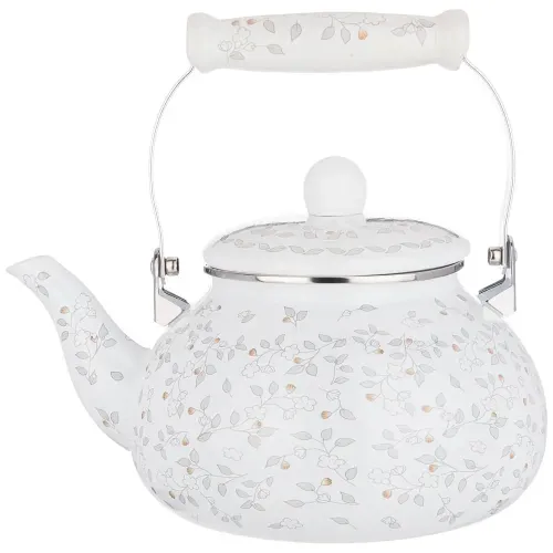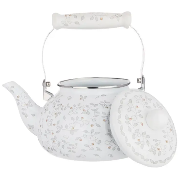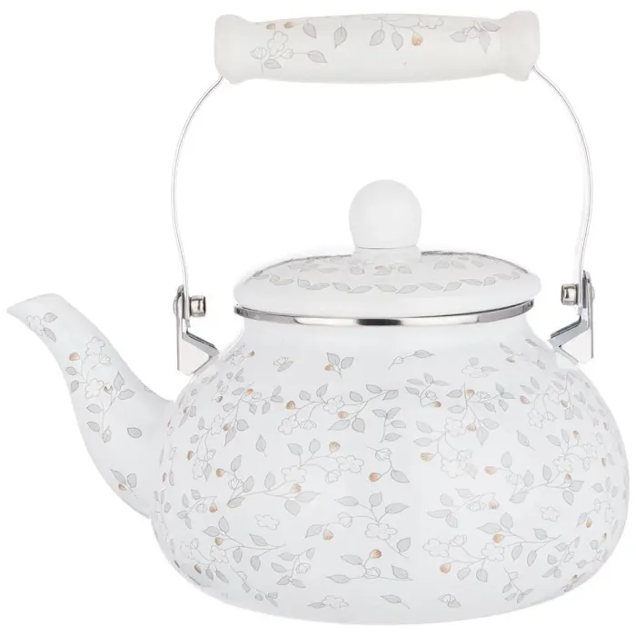 Чайник изготовлен из эмалированной стали. Эмалированное покрытие обладает гигиеничными свойствами, не впитывает запахи и облегчает уход. Конструкция включает ручку с ограничителем, предназначенную для безопасного использования.