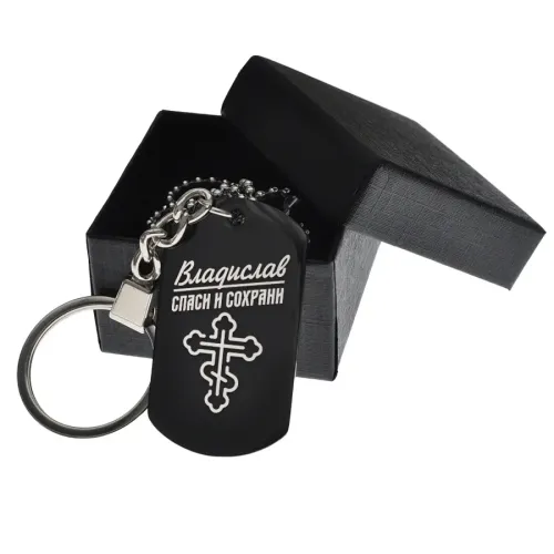 Размеры и комплектация: Размер 49х28 мм. В комплекте кольцо для ключей и регулируемая шариковая цепочка. Упаковка: коробка.