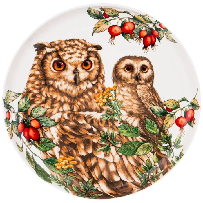 Тарелка выполнена из тонкого фарфора, материала, известного своей гигиеничностью и устойчивостью к механическим воздействиям. Поверхность украшена декоративным изображением совы. Функциональность изделия обеспечивается возможностью использования в микроволновой печи и мытья в посудомоечной машине.