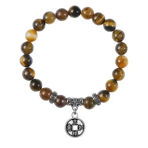 Браслет из натурального камня тигровый глаз с подвеской-монетой из бижутерного сплава.