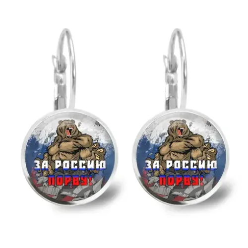 Серьги «За Россию порву!» — бижутерный аксессуар с выпуклыми стеклянными линзами и замком типа левербэк.