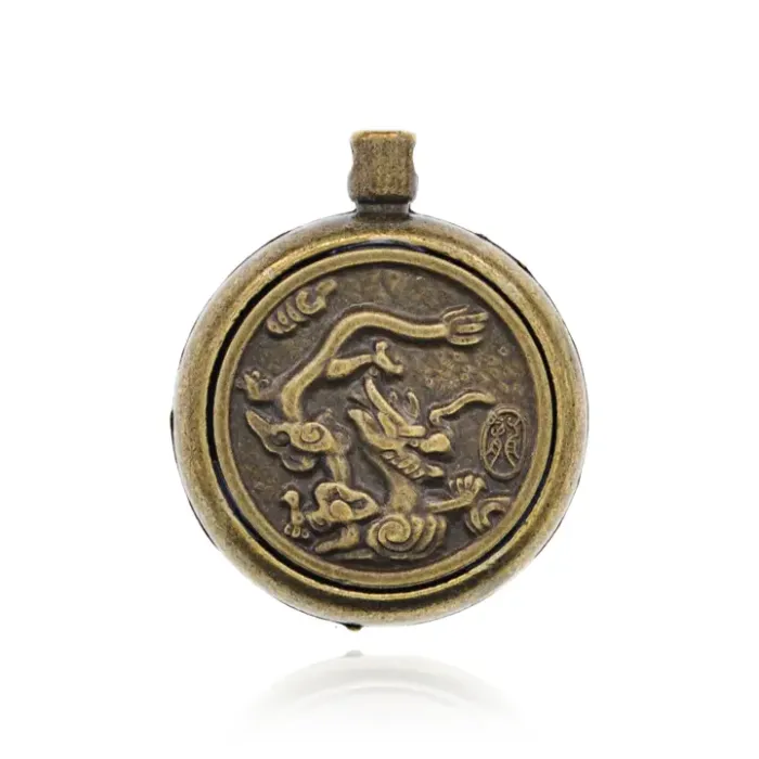 Кулон с символикой восточного гороскопа в виде дракона и молитвенным барабаном на обратной стороне.