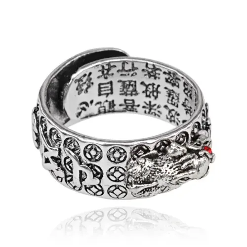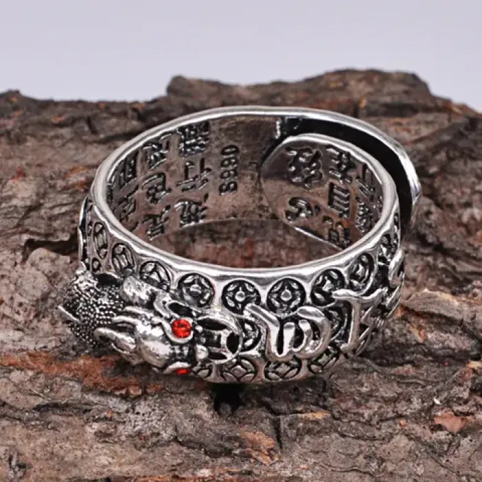 Безразмерное кольцо с монетой Пи Щу, выполнено из металла с покрытием под серебро и вставками из страз.
