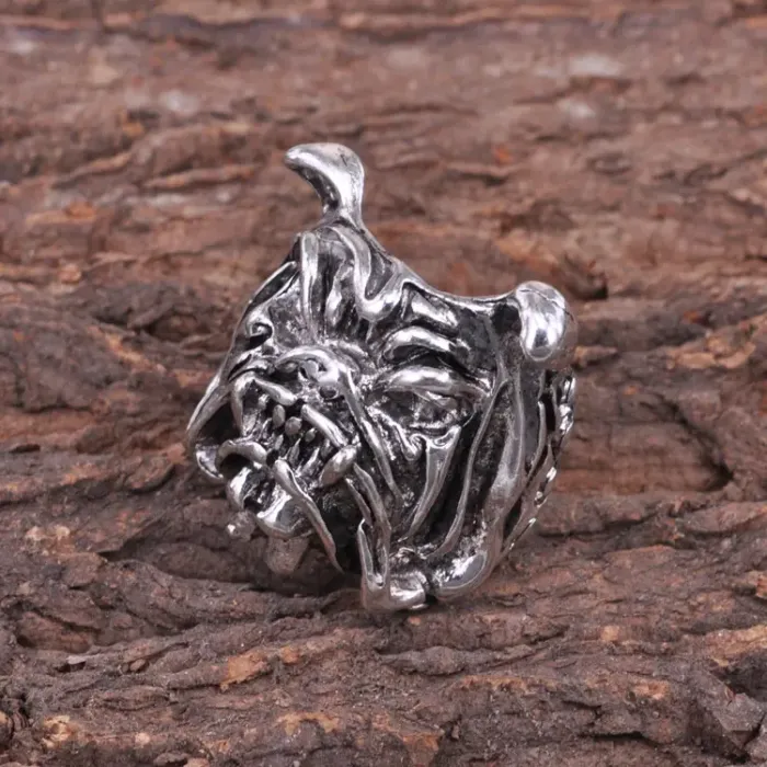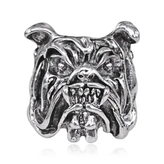 Безразмерное кольцо с дизайном «Бульдог». Изготовлено из металла с покрытием под серебро, ширина составляет 30 мм.