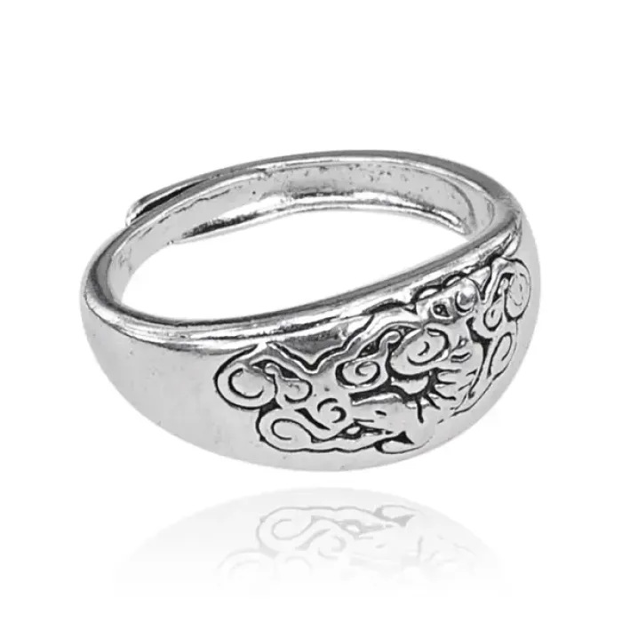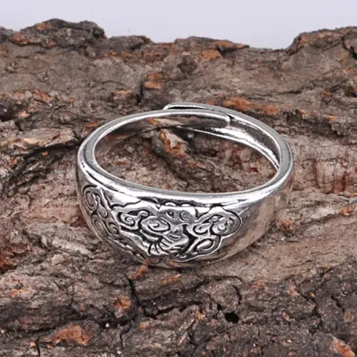 Безразмерное кольцо с символом Тигра по восточному гороскопу. Изготовлено из металла с покрытием под серебро, ширина 9 мм.