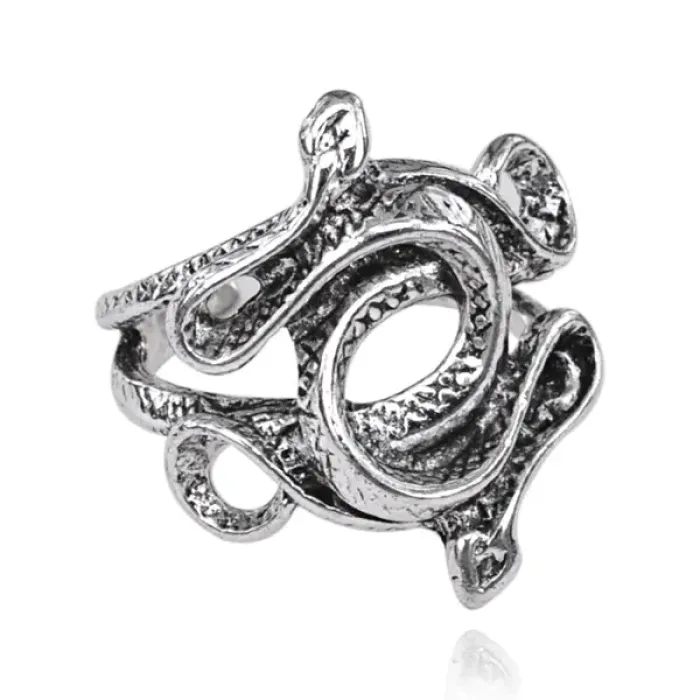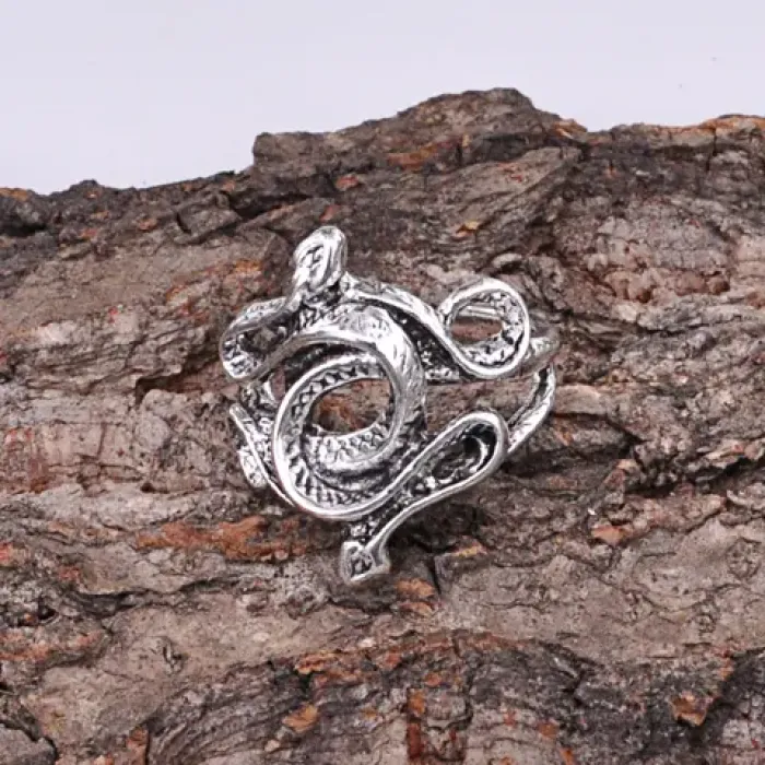 Безразмерное кольцо в форме змеи. Изготовлено из металла с покрытием под серебро.