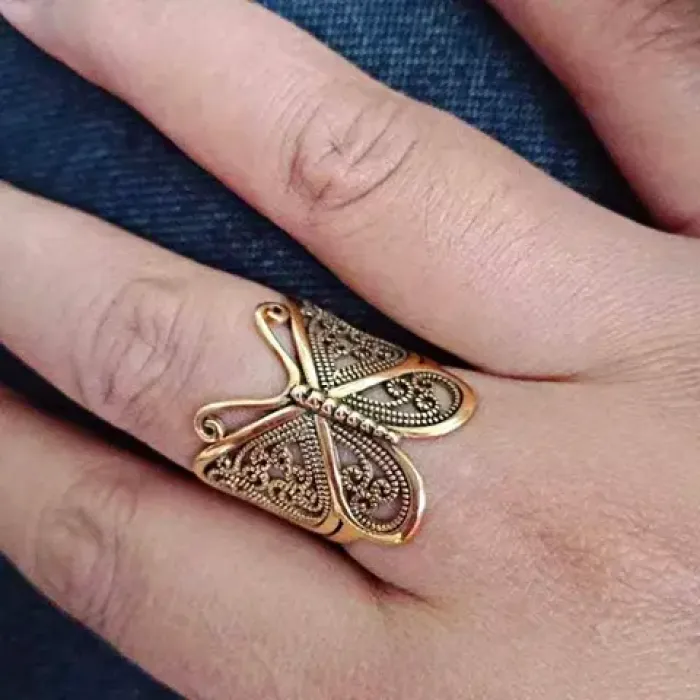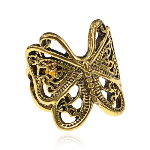 Безразмерное кольцо с дизайном бабочки. Материал — металл с покрытием под золото.