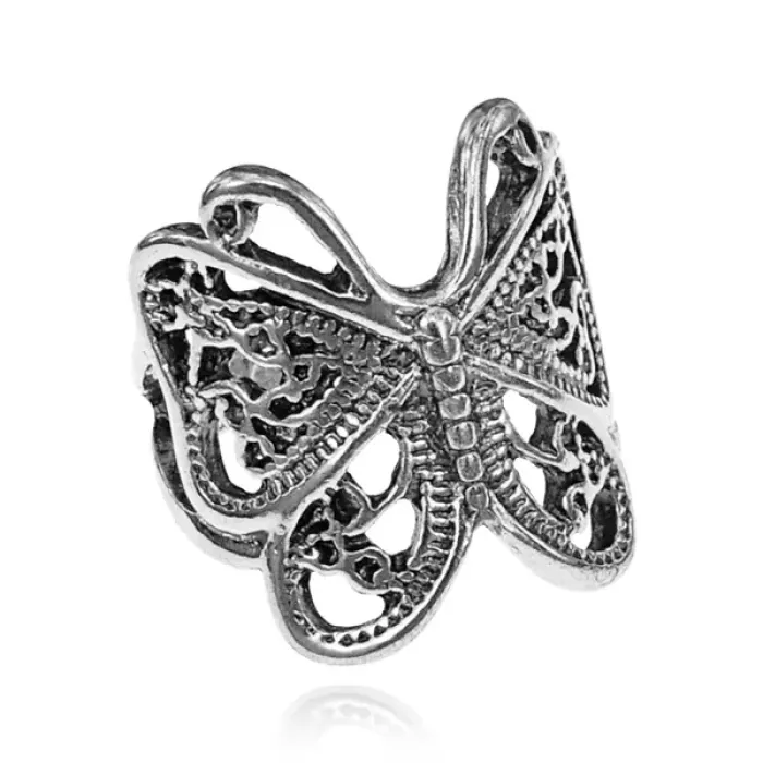 Безразмерное кольцо в форме бабочки из металла с серебряным покрытием.