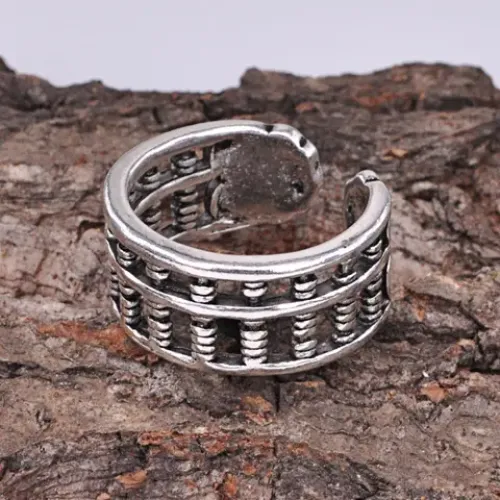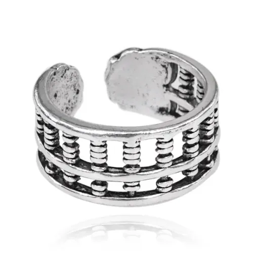 Безразмерное кольцо с дизайном в виде счётов. Материал — металл с покрытием под серебро, ширина 9 мм.