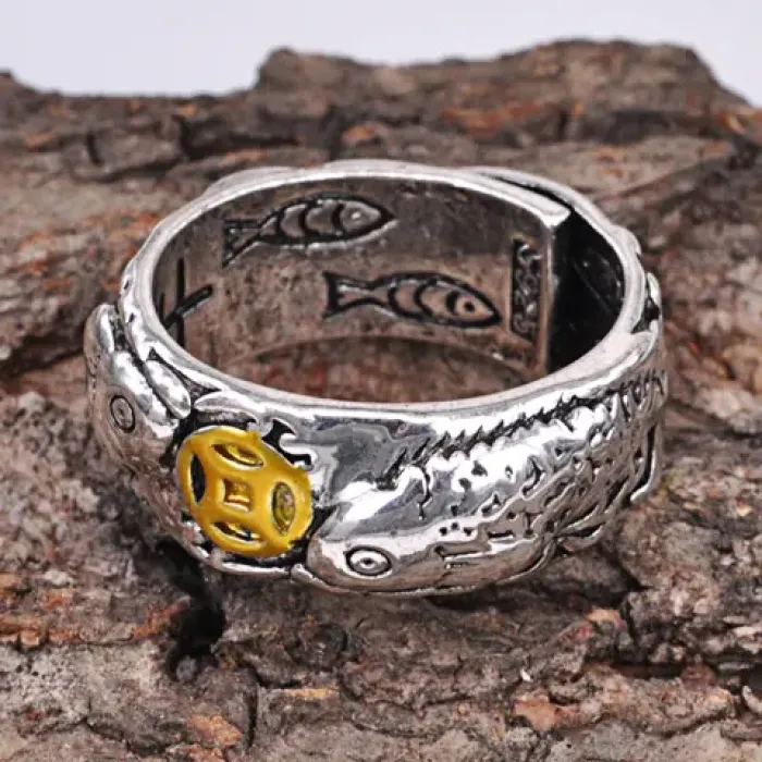 Безразмерное кольцо с дизайном двух карпов и монеты. Изготовлено из металла с покрытием под серебро и эмалью.