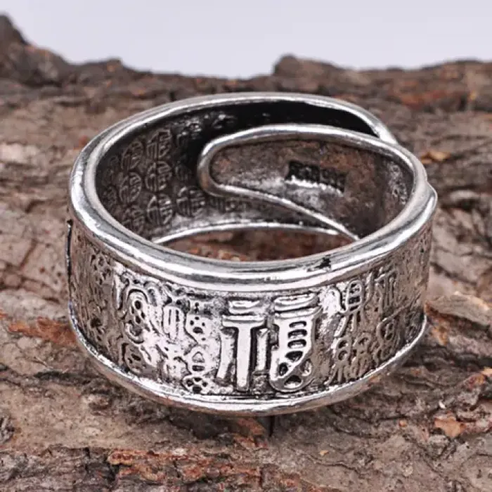 Безразмерное кольцо с символикой, изготовленное из металла с покрытием под серебро.