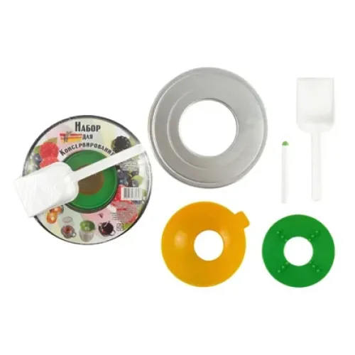 Элементы набора изготовлены из пластика и металла, что обеспечивает их долговечность и простоту в уходе. Воронка предназначена для аккуратного переливания жидкостей, переходник обеспечивает герметичность при закручивании крышек на стандартных банках. Стерилизатор используется для обработки банок, совочек — для дозирования ингредиентов, а магнитная палочка упрощает извлечение металлических крышек.