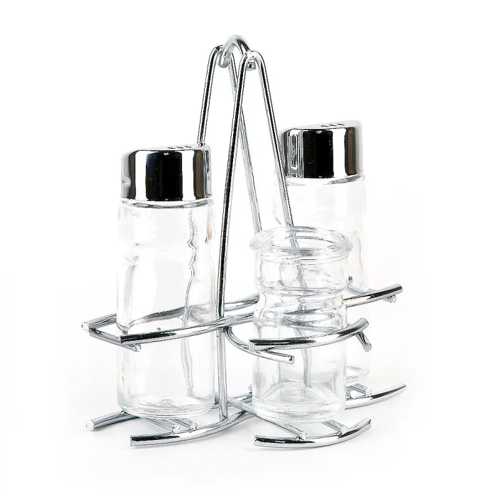 Набор для специй из трёх предметов предназначен для хранения соли, перца и зубочисток на кухне. В комплект входят солонка, перечница и баночка, размещённые на общей металлической подставке для организации пространства. Изделия выполнены из стекла и металла.