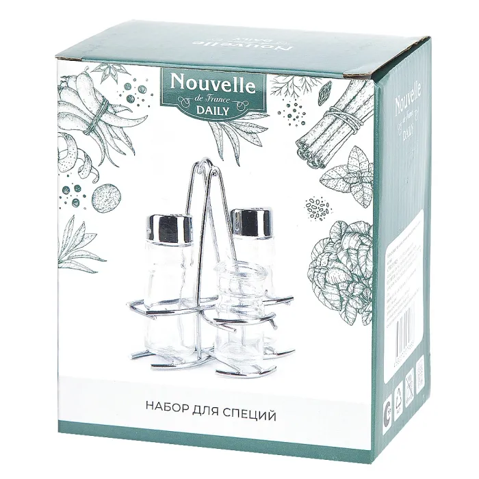 Основной материал — стекло, которое обеспечивает гигиеничность и позволяет визуально контролировать уровень содержимого. Металлическая подставка служит для компактного размещения всех предметов набора. Конструкция солонки и перечницы оснащена крышками с отверстиями для дозированной подачи специй.
