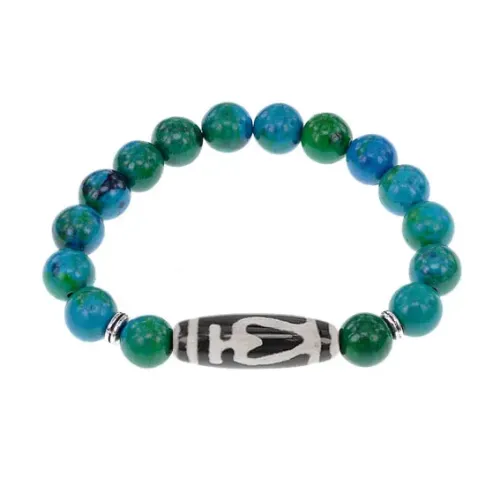 Стрейч-браслет с тибетской бусиной Дзи Бумпа из агата и синтетическим камнем, имитирующим хризоколлу.