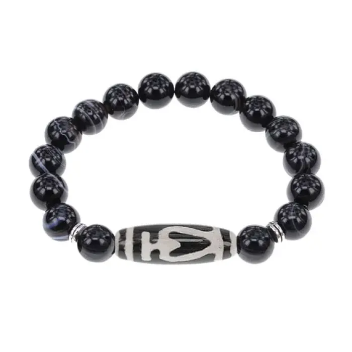Стрейч-браслет из натурального камня с тибетской бусиной Дзи, выполненный из черного агата.
