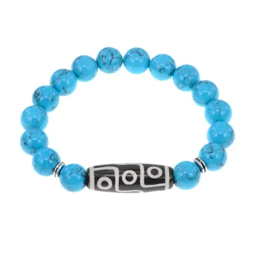 Стрейч-браслет с тибетской бусиной Дзи из натурального агата и синтетическим камнем, имитирующим бирюзу.