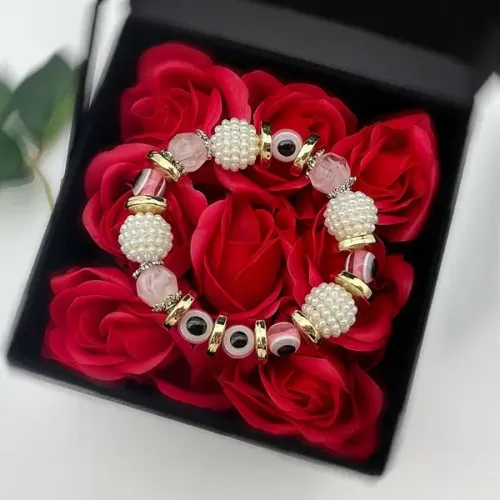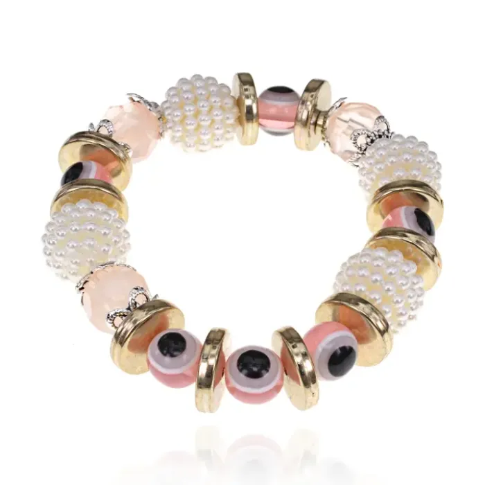 Стрейч-браслет от сглаза из искусственного жемчуга, стекла и пластика с бусинами разного диаметра.
