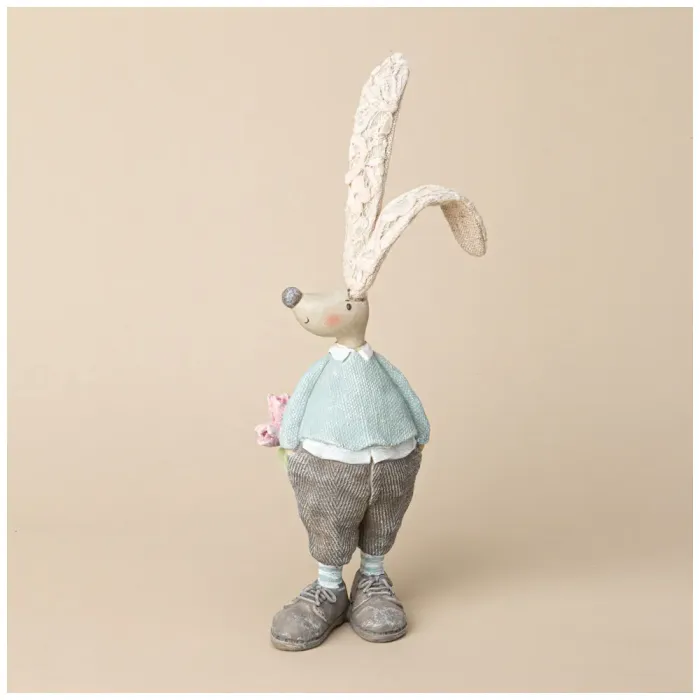 Фигурка выполнена в виде кролика в светлом свитере и штанишках с тонкими линиями. Длинные уши украшены кружевом, что подчеркивает уникальность изделия. Нежный букет розового цвета гармонично контрастирует с мягкими оттенками одежды, добавляя яркий акцент.