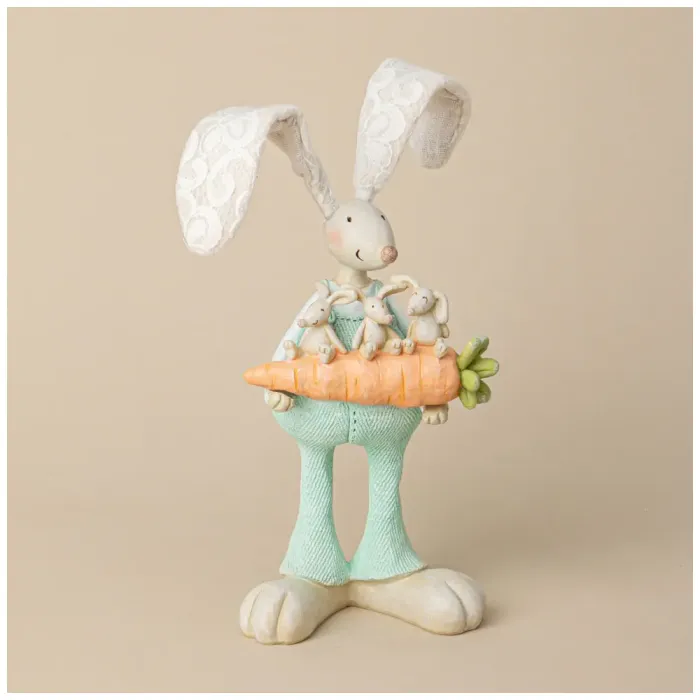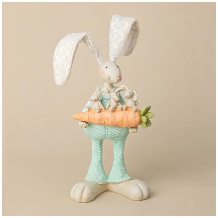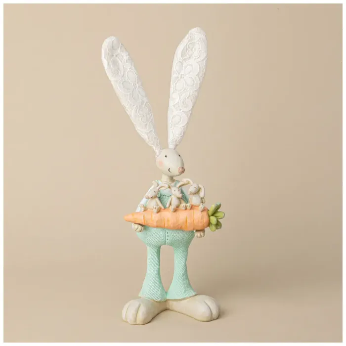 Фигурка кролика имеет продуманную конструкцию: в лапках он держит яркую морковь с зелеными листьями, а его штанишки нежного мятного оттенка гармонично дополняют общий образ. Детали изделия тщательно проработаны, что делает его привлекательным акцентом в интерьере.
