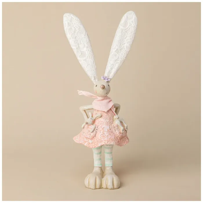Фигурка изготовлена из полистоуна и текстиля, что обеспечивает долговечность и приятный внешний вид. Кролик одет в платье из тонкой кружевной ткани нежно-розового цвета, дополненное светло-зелёными полосатыми носочками и аккуратным шарфиком. Цветочный аксессуар на ушах добавляет особую нотку женственности.