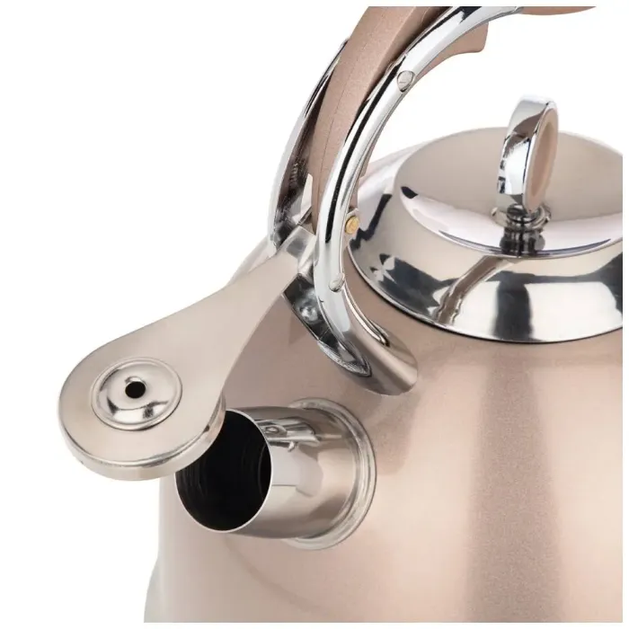 Корпус выполнен из нержавеющей стали, что обеспечивает прочность и гигиеничность. Капсульное дно содержит алюминиевую прослойку для равномерного и быстрого нагрева. Конструкция включает свисток, сигнализирующий о закипании, клапан на ручке для удобного наливания и жаропрочное покрытие корпуса.