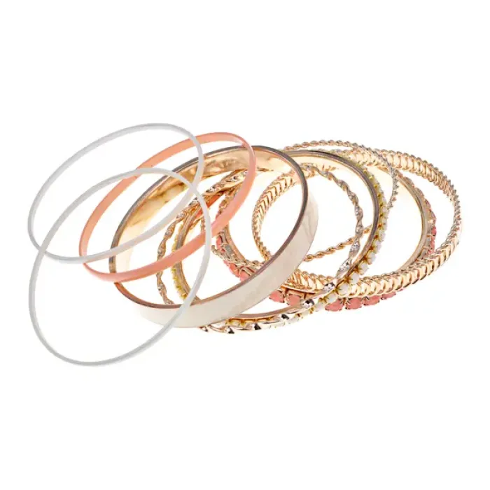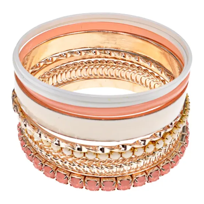 Набор из 9 браслетов для ношения. Материал — бижутерный сплав, дизайн с нежно-розовыми стразами и золотистым покрытием.