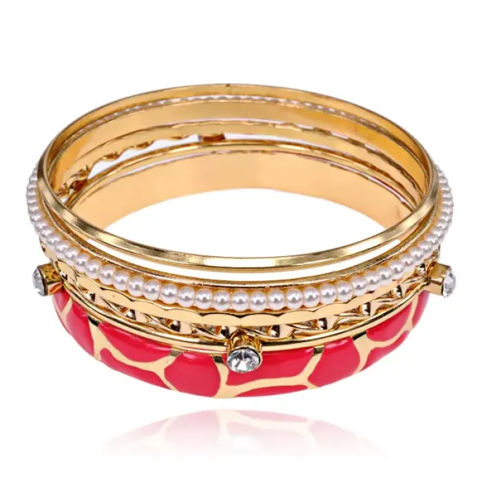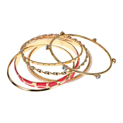 Набор из шести браслетов для ношения. Материал — бижутерный сплав с покрытием под золото, эмалью, искусственным жемчугом и стразами.