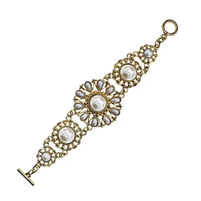 Бижутерный браслет с элементами в виде цветов и искусственным жемчугом.